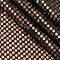 Трикотажное черное полотно с блестящими зеркальными золотистыми круглыми пайетками. Декор накатан на основу, поэтому будет комфортен в носке. Ткань пластичная, прекрасно драпируется и укладывается в складки, легко садится по фигуре за счёт основы с эластаном, не прозрачная, позволит шить изделия без подклада. Идеально подойдет для пошива нарядных вечерних образов: платья, юбки, топа, туники, широких брюк, жакета, кардигана.