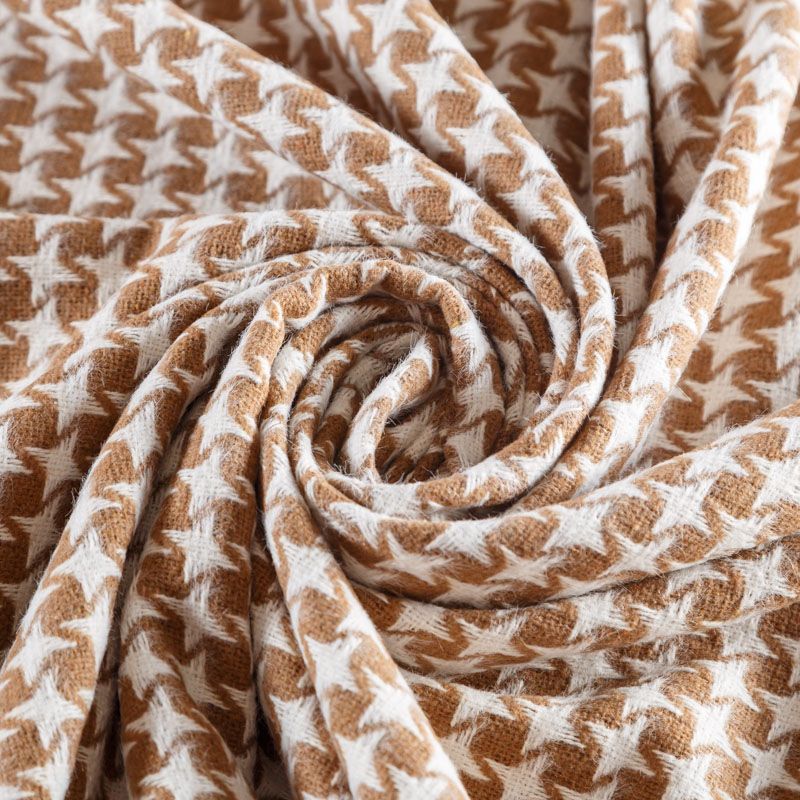 Костюмный твид с карамельного оттенка с геометрическим узором молочного цвета. Ткань плотная, мягкая, приятная на ощупь, прочная, не вытирается. Отличный выбор для осенних костюмов, облегченного пальто, куртки, бомбера, юбки, шорт или теплого платья.
