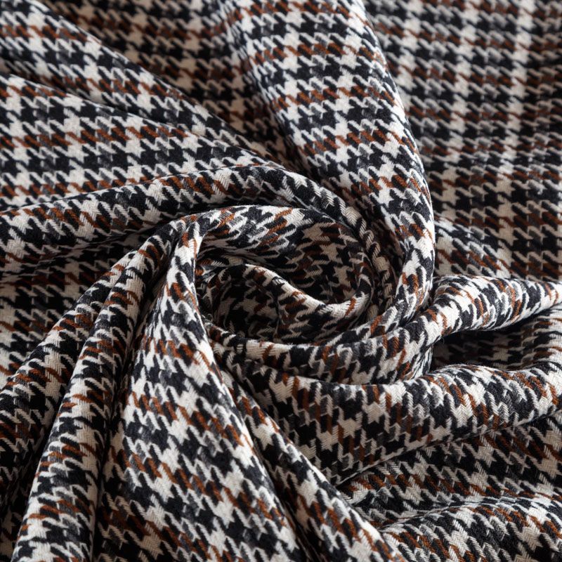 Твид молочного оттенка с плетеной матовой поверхностью, мелкий узор "гусиная лапка" образуется переплетением серых, коричневых и черных нитей. Ткань не сухая, мягкая, но плотная, не просвечивает, теплая, хоршо драпируется. Отлично подойдет для пошива легкой верхней одежды, жакетов, костюмов, юбок.