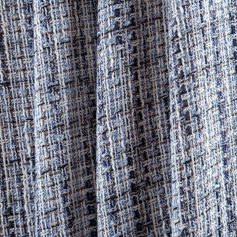 Отличительная особенность этой ткани в полотняном плетении нитей, характерного для рогожки, олицетворяющая сложную "клетчатую" геометрию в бело-голубых оттенках. Различная толщина нитей создает эффектную фактуру. Ткань неплохо держит форму, пластичная и гибкая за счет плетения, матовая, мягкая, приятная на ощупь. Прекрасно подойдет для пошива жакета, юбки, легкого пальто, костюма, жилета, кардигана, шорт.