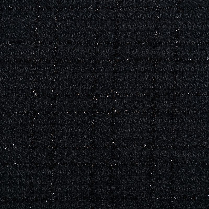 Твид средней плотности с рельефной поверхностью черного цвета с добавлением акцента в виде люрексовой нити, которая имитирует клетку и добавляет ткани нарядности. Твид пластичный, хорошо драпируется, умеренно держит форму, прекрасно подойдет для пошива жакетов на подкладе, жилетов, кардиганов, легких пальто, юбок и платьев.