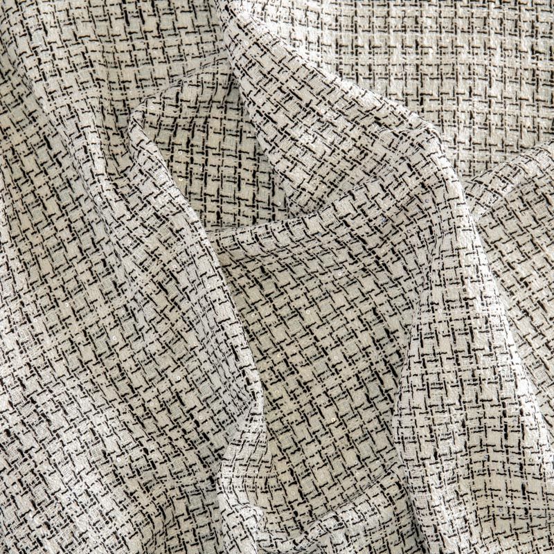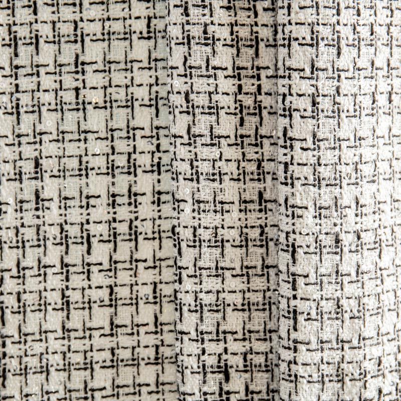 Мягкая, пластичная и объемная ткань, с разреженной и рельефной вывязанной структурой. Буклированный твид в стиле Шанель буквально соткан из различных по толщине и цвету нитей, образующих рисунок в виде клетки. В плетение добавлена серебристая люрексная нить, а также мелкие пайетки. Твид идеально подходит для пошива платьев, юбок, жакетов и легких пальто в стиле Шанель.