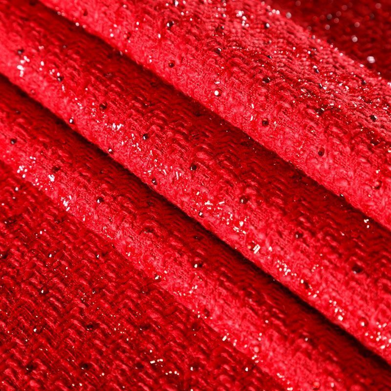 Плотный, в меру объемный твид с легким эффектом букле из нитей рубиново-красного оттенка с добавлением акцента в виде люрексовой нити и страз в цвет ткани. Твид пластичный, хорошо драпируется, умеренно держит форму, прекрасно подойдет для пошива жакетов на подкладке, жилетов, кардиганов, легких пальто, юбок и платьев.
