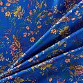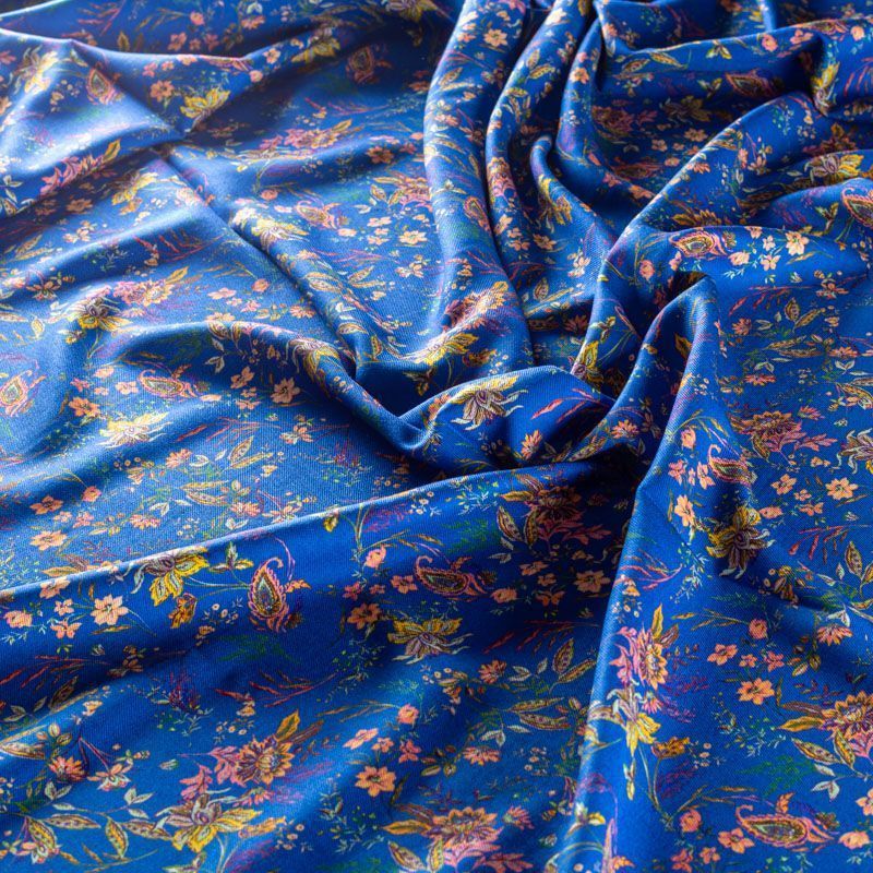 Итальянский твил-штапель с цветочным принтом на васильковом фоне. Плотная и мягкая ткань, имеет саржевое плетение и характерный диагональный рубчик на поверхности. Отлично сохраняет форму, не сильно мнется и не деформируется в процессе эксплуатации.  Красиво ложиться в складки, поэтому прекрасно подойдет на длинные драпированные юбки и платья, на свободные брюки или шорты, топы.