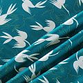 Итальянский вискозный твил-штапель со стилизованным принтом в виде летящих птици темно-бирюзового оттенка. Мягкая ткань средней плотности, имеет саржевое плетение и характерный диагональный рубчик на поверхности. Хорошо сохраняет форму, не сильно мнется и не деформируется в процессе эксплуатации. Красиво ложится в складки, поэтому прекрасно подойдет на длинные драпированные юбки и платья, туники, на свободные брюки или шорты, топы.