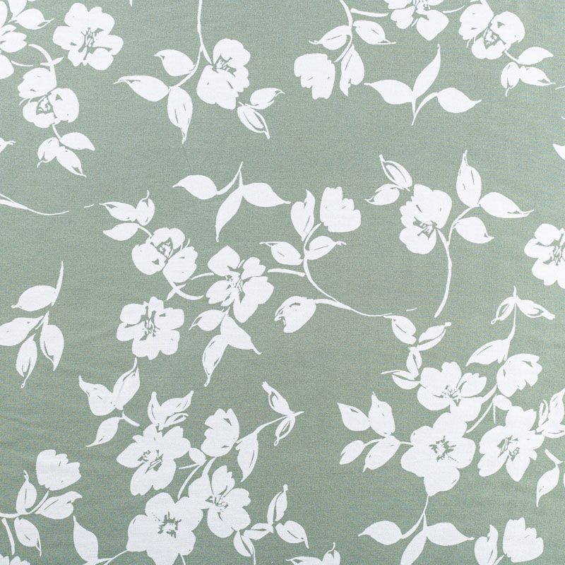 Качественный твил-штапель с белым цветочным принтом на фисташковом фоне. Мягкая ткань средней плотности, имеет саржевое плетение и характерный диагональный рубчик на поверхности. Хорошо сохраняет форму, не сильно мнется и не деформируется в процессе эксплуатации.  Красиво ложится в складки, поэтому прекрасно подойдет на длинные драпированные юбки и платья, на свободные брюки или шорты, топы.