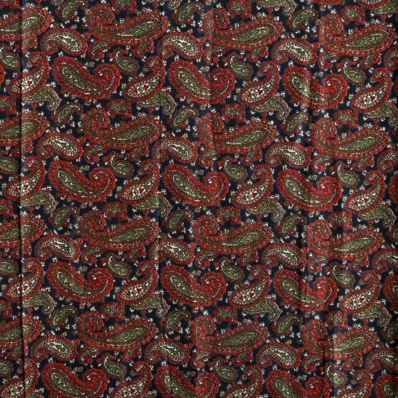 Плотная и мягкая ткань черного цвета с узором пейсли в красно-зеленых оттенках, имеет саржевое плетение и характерный диагональный рубчик на поверхности. Отлично сохраняет форму, не сильно мнется и не деформируется в процессе эксплуатации. Красиво ложится в складки, поэтому прекрасно подойдет на длинные драпированные юбки и платья, на свободные брюки или шорты, топы.