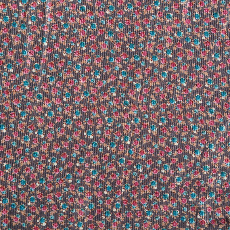 Плотная и мягкая ткань серого оттенка с мелкоцветным принтом, имеет саржевое плетение и характерный диагональный рубчик на поверхности. Отлично сохраняет форму, не сильно мнется и не деформируется в процессе эксплуатации. Красиво ложится в складки, поэтому прекрасно подойдет на длинные драпированные юбки и платья, на свободные брюки или шорты, топы.