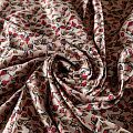 Плотная и мягкая ткань песочного оттенка с мелкоцветным принтом, имеет саржевое плетение и характерный диагональный рубчик на поверхности. Отлично сохраняет форму, не сильно мнется и не деформируется в процессе эксплуатации. Красиво ложится в складки, поэтому прекрасно подойдет на длинные драпированные юбки и платья, на свободные брюки или шорты, топы.