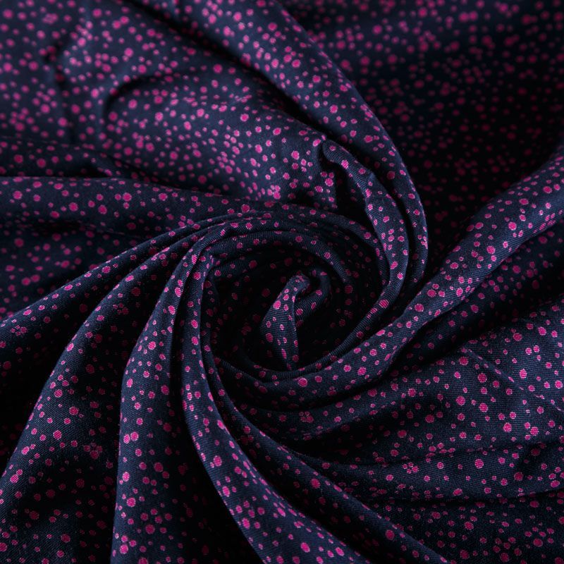 Плотная и мягкая ткань фиолетово-синего оттенка с хаотичным мелким принтом цвета фуксии, имеет саржевое плетение и характерный диагональный рубчик на поверхности. Отлично сохраняет форму, не сильно мнется и не деформируется в процессе эксплуатации. Красиво ложится в складки, поэтому прекрасно подойдет на длинные драпированные юбки и платья, на свободные брюки или шорты, топы.