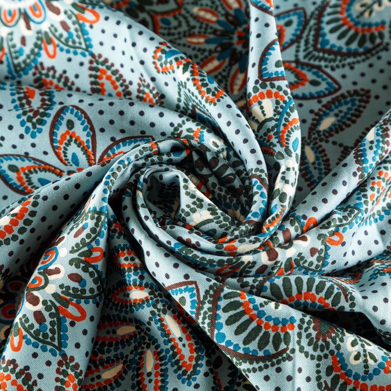 Плотная и мягкая ткань мятно-зеленого оттенка со стилизованным цветочным орнаментом, имеет саржевое плетение и характерный диагональный рубчик на поверхности. Отлично сохраняет форму, не сильно мнется и не деформируется в процессе эксплуатации. Красиво ложится в складки, поэтому прекрасно подойдет на длинные драпированные юбки и платья, на свободные брюки или шорты, топы.