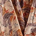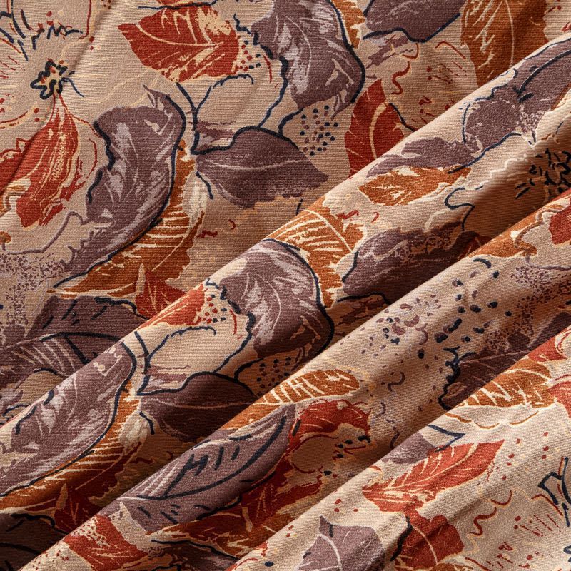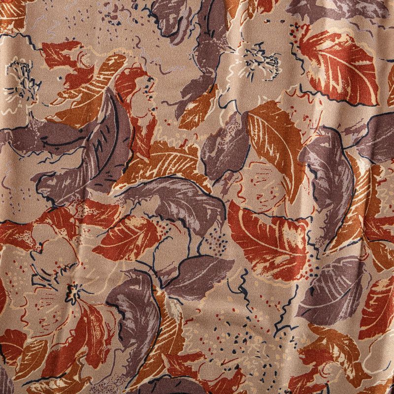 Плотная и мягкая ткань бежевого цвета с растительным принтом в осенних оттенках, имеет саржевое плетение и характерный диагональный рубчик на поверхности. Отлично сохраняет форму, не сильно мнется и не деформируется в процессе эксплуатации. Красиво ложится в складки, поэтому прекрасно подойдет на длинные драпированные юбки и платья, на свободные брюки или шорты, топы, комбинезоны, а также для домашней одежды.