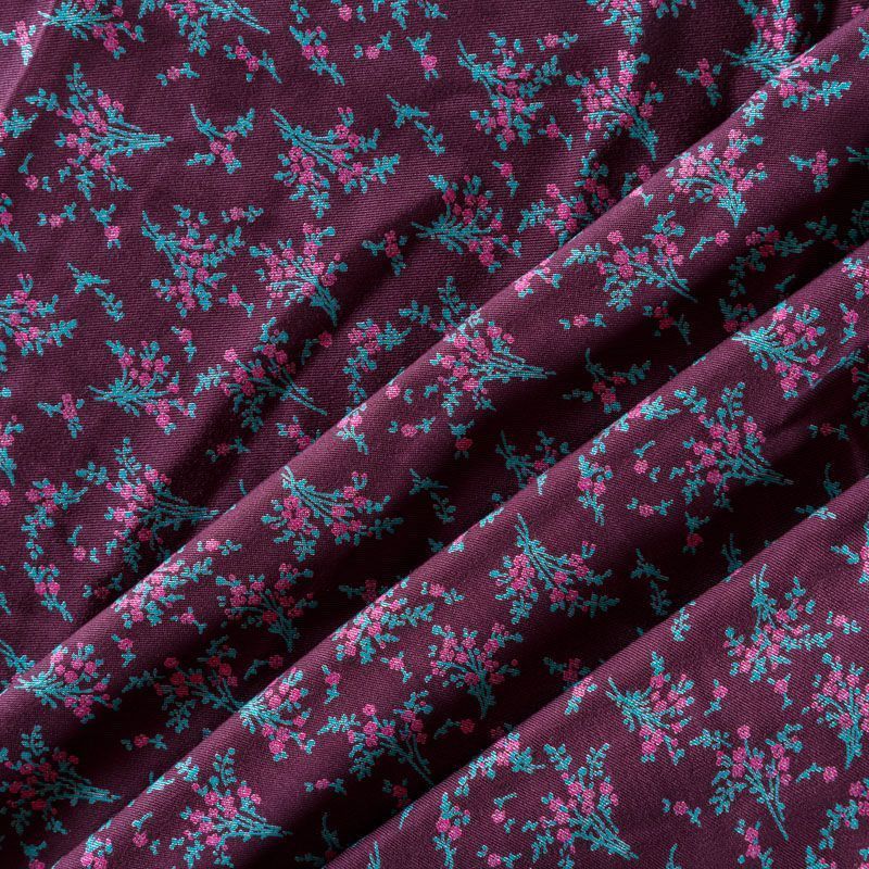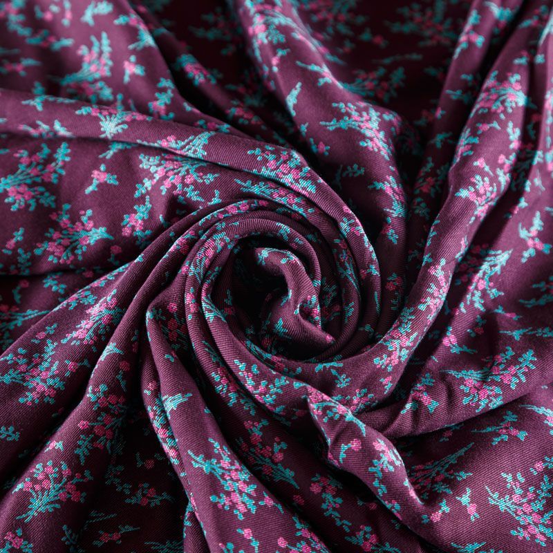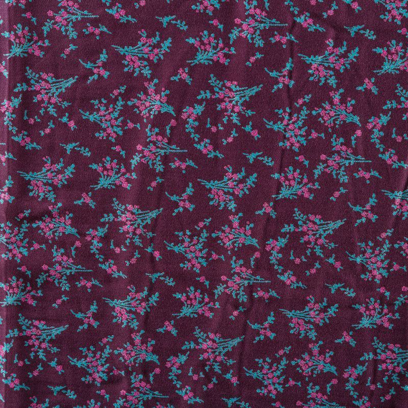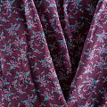 Плотная и мягкая ткань сливового оттенка с ярким мелкоцветом, имеет саржевое плетение и характерный диагональный рубчик на поверхности. Отлично сохраняет форму, не сильно мнется и не деформируется в процессе эксплуатации. Красиво ложится в складки, поэтому прекрасно подойдет на длинные драпированные юбки и платья, на свободные брюки или шорты, топы, комбинезоны, а также для домашней одежды.