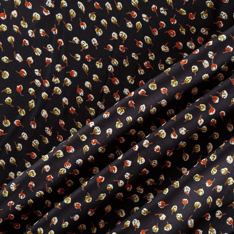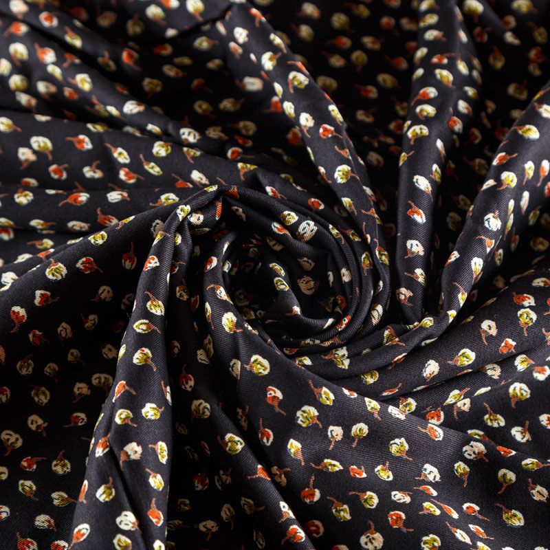 Плотная и мягкая ткань черного цвета с ярким мелкоцветом, имеет саржевое плетение и характерный диагональный рубчик на поверхности. Отлично сохраняет форму, не сильно мнется и не деформируется в процессе эксплуатации. Красиво ложится в складки, поэтому прекрасно подойдет на длинные драпированные юбки и платья, на свободные брюки или шорты, топы, комбинезоны, а также для домашней одежды.