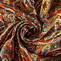 Плотная и мягкая ткань бежевого оттенка с богатым узором пейсли в желто-коричневых тонах, имеет саржевое плетение и характерный диагональный рубчик на поверхности. Отлично сохраняет форму, не сильно мнется и не деформируется в процессе эксплуатации. Красиво ложится в складки, поэтому прекрасно подойдет на длинные драпированные юбки и платья, на свободные брюки или шорты, топы, комбинезоны, а также для домашней одежды.