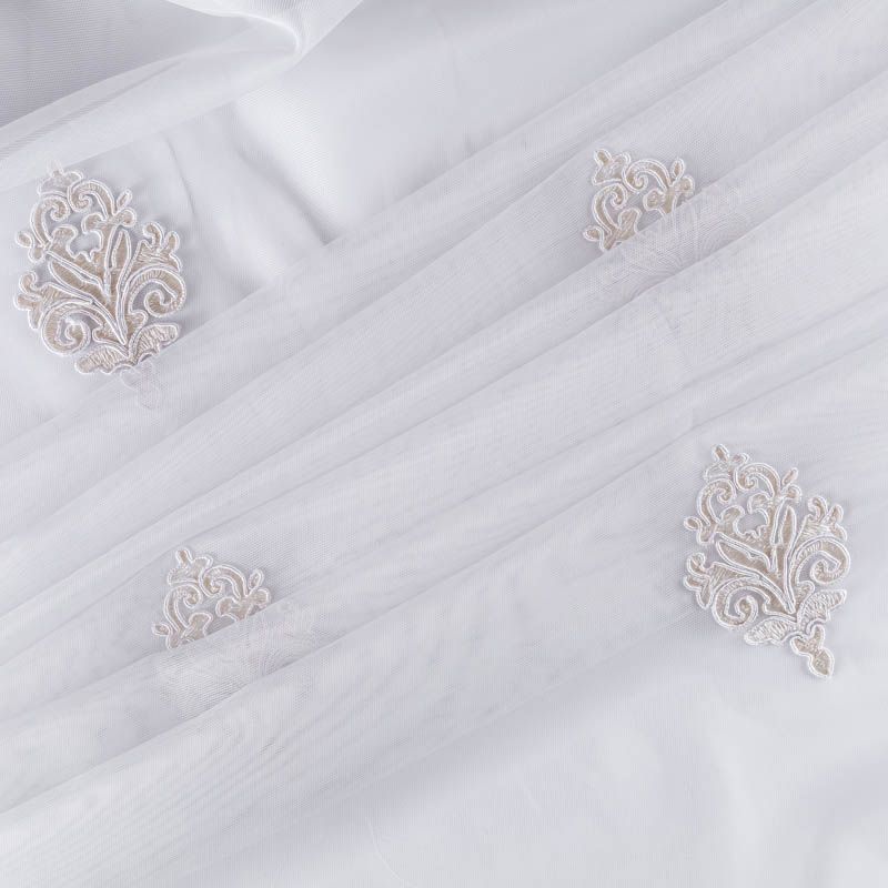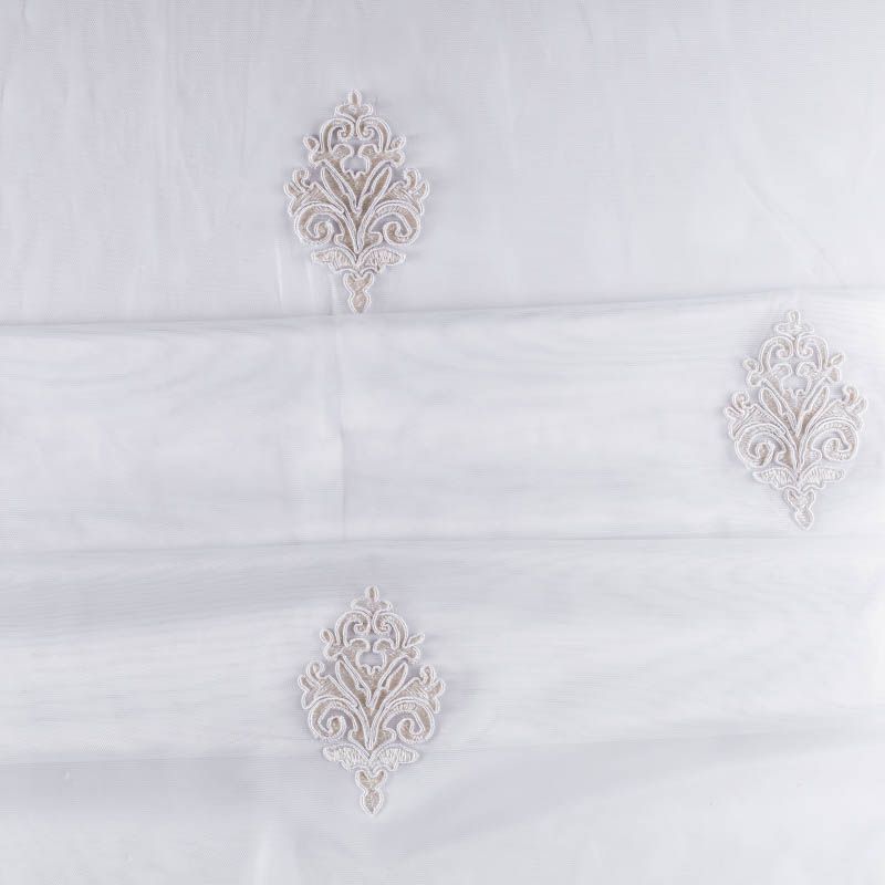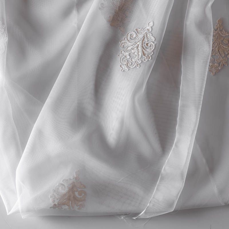Сетка с вышивкой – это роскошный элемент дизайна, который преобразит любое помещение. Она отлично пропускает воздух, поэтому быстро сохнет после стирки. Прочная, ткань прослужит долго. Выдерживает большое количество стирок. Легкая, фактура ткани практически невесома, поэтому можно не опасаясь крепить ее даже на самый тонкий карниз. Сутажная элегантная вышивка приятного сливочного оттенка в виде "дамасков" расположена по всей высоте ткани, нижний край украшен вышитым фестоном, без утяжелителя, фигурный.