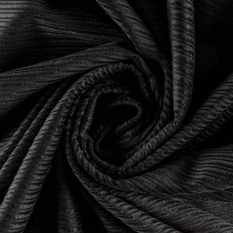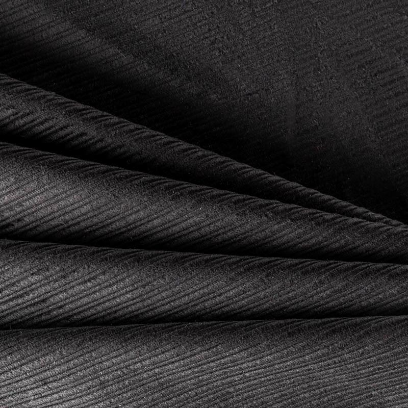 Итальянский костюмно-плательный вельвет из хлопка в черном цвете. Очень приятный тактильно, поверхность бархатистая, сложный рубчик средней ширины, не тянется, не просвечивает. Подойдет для пошива костюма, платья, юбки, брюк, верхней одежды.