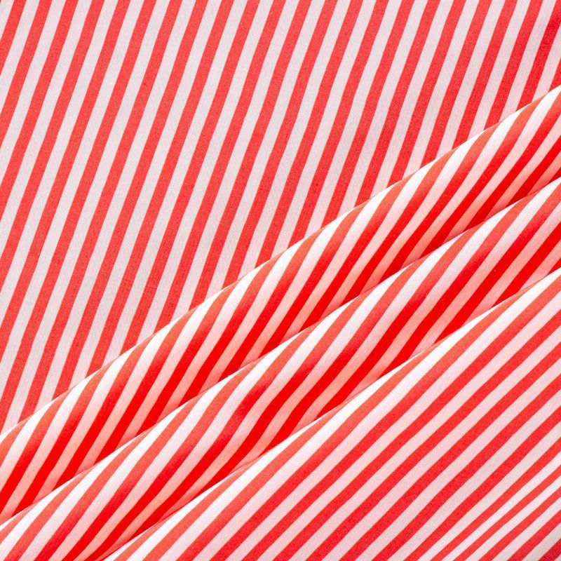 Плательно-рубашечная итальянская вискоза с принтом в горизонтальную полоску красного цвета. Натуральная, дышащая ткань, очень приятная к телу, отлично драпируется, струится, не просвечивает. Хорошо подойдет для пошива платьев, рубашек, платьев-рубашек, блуз, юбок, брюк, летних костюмов, пыльников, детской одежды.