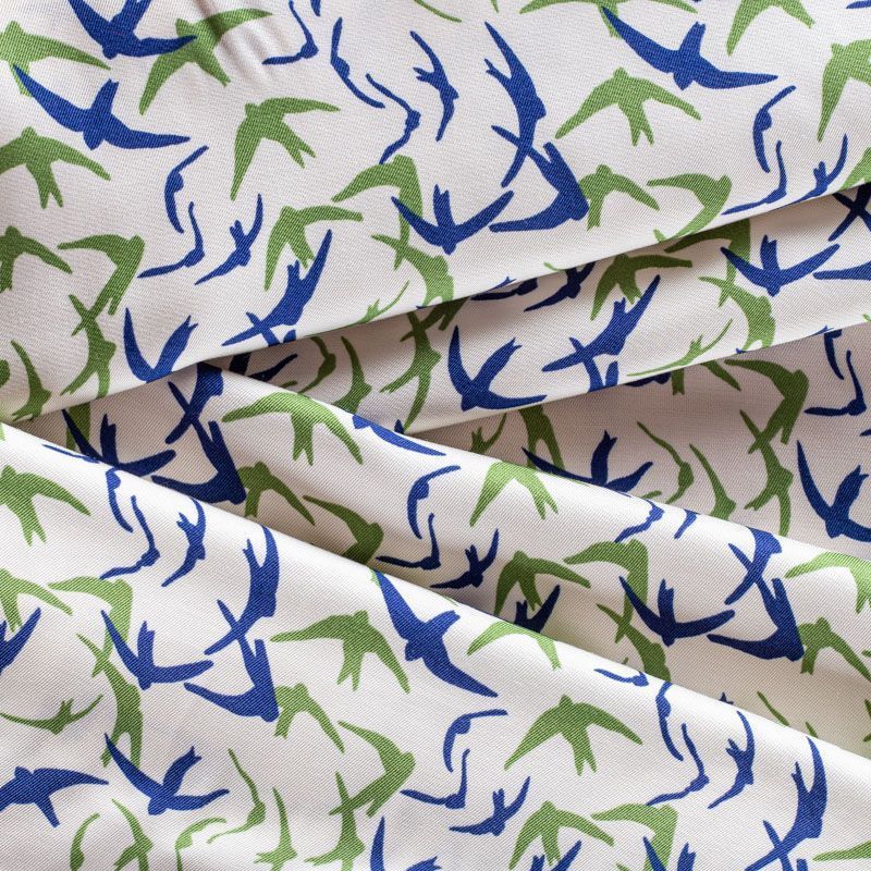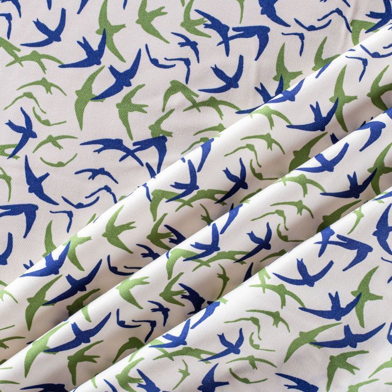 Итальянская жаккардовая вискоза молочного цвета с символами наступления весны - ласточками. Ткань тонкая, но не просвечивает, отлично драпируется и струится, приятная на ощупь. Прекрасно подойдет для пошива платья, сарафана, топа, блузки, рубашки, юбки, пижамного костюма.