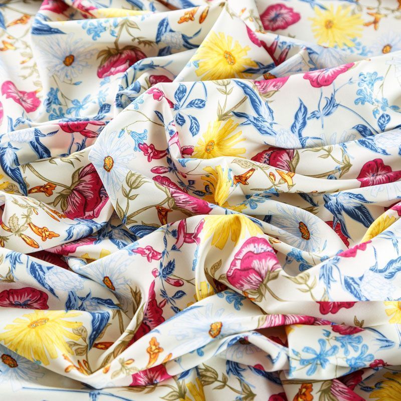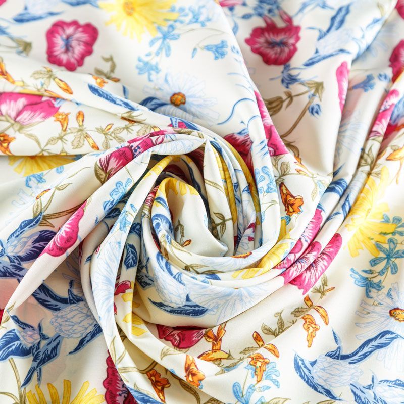 Легкая набивная ткань имеет высокую прочность, большую износоустойчивость. Материал упругий, мягкий, тянется за счет эластана в составе, хорошо драпируется, образует струящиеся складки. Идеально подойдет для пошива блуз, юбок, платьев, сарафанов.