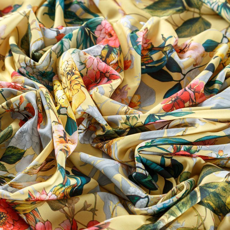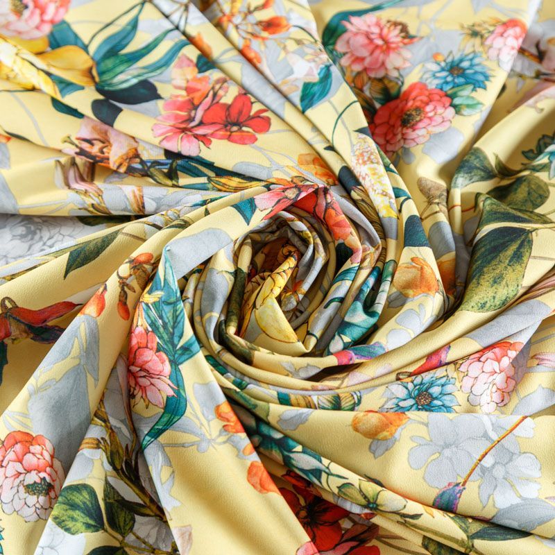 Легкая набивная ткань имеет высокую прочность, большую износоустойчивость. Материал упругий, мягкий, тянется за счет эластана в составе, хорошо драпируется, образует струящиеся складки. Идеально подойдет для пошива блуз, юбок, платьев, сарафанов.
