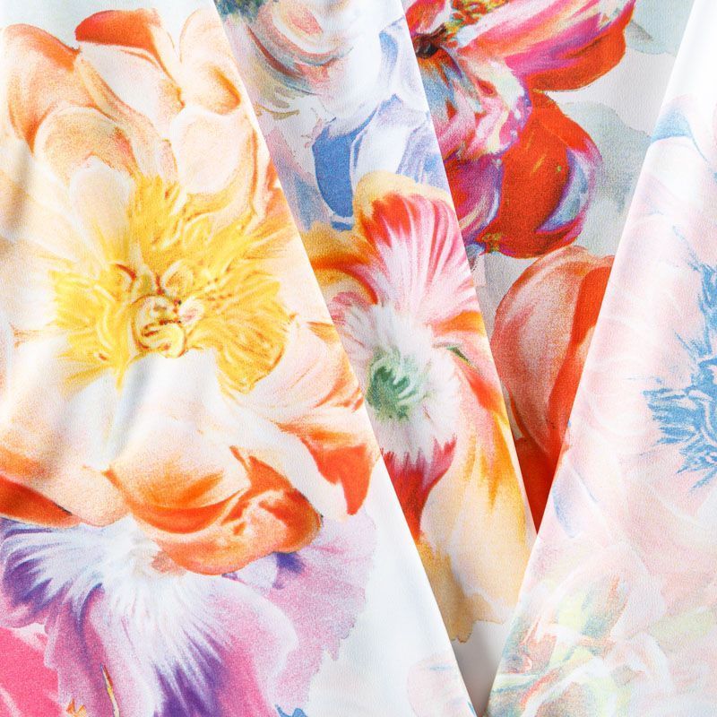 Легкая набивная ткань имеет высокую прочность, большую износоустойчивость. Материал упругий, мягкий, тянется за счет эластана в составе, хорошо драпируется, образует струящиеся складки. Идеально подойдет для пошива блуз, юбок, платьев, сарафанов.