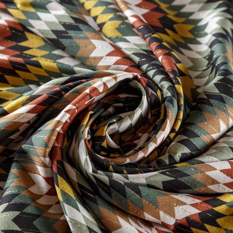 Итальянская плательно-блузочная вискоза с этническим мотивом декорирована тонкой люрексовой нитью. Ткань очень пластичная, отлично драпируется и струится, мягкая и приятная на ощупь, немного просвечивает. Прекрасно подойдет для пошива платья, топа, блузки, юбки.