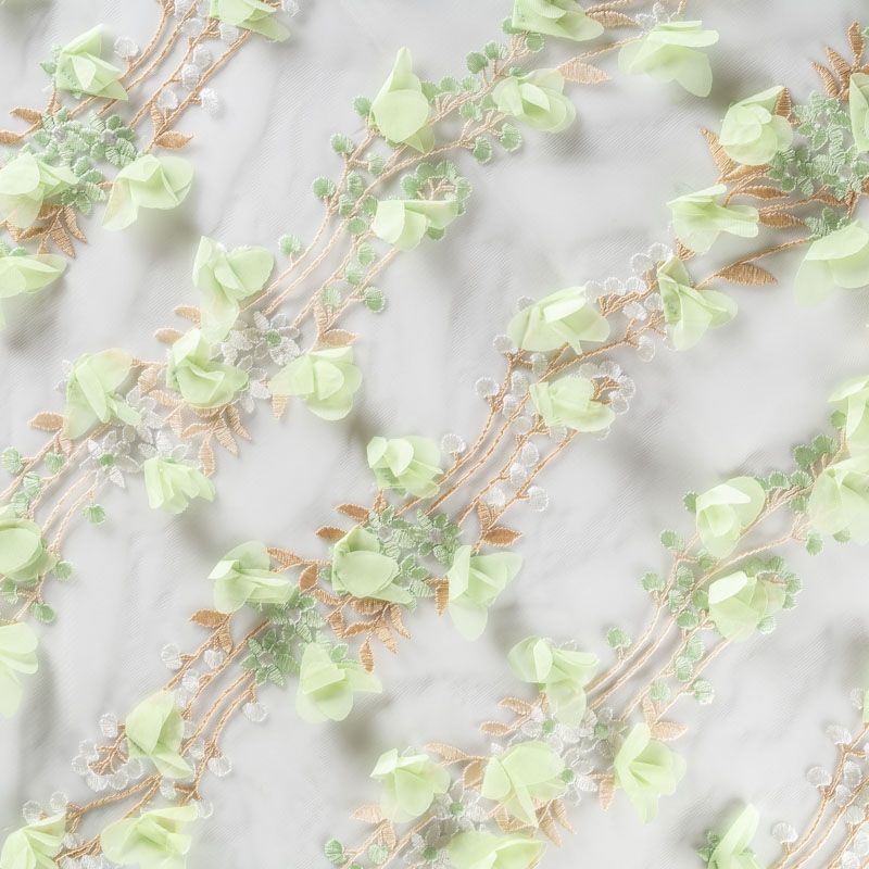 Необычная вышивка на сетке с 3D эффектом - воздушный, пластичный, трогательный купон на сетке основе молочного цвета. Оттенок смотрится благородно, а цветы из нежного шифона салатового цвета подвижны и создают весеннее настроение.