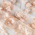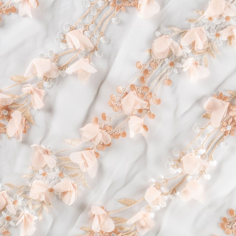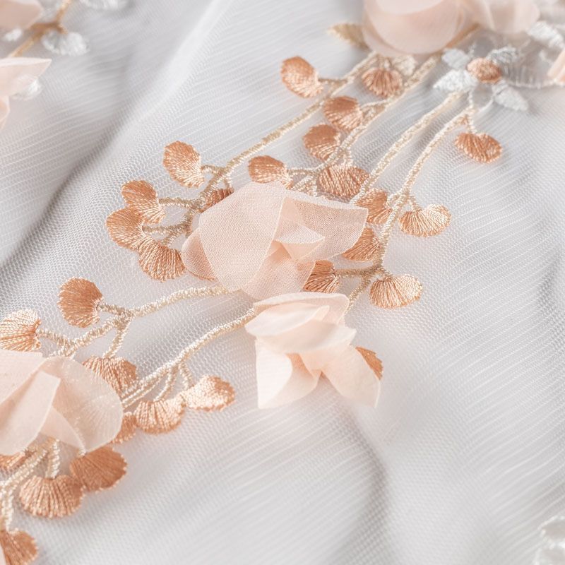 Необычная вышивка на сетке с 3D эффектом - воздушный, пластичный, трогательный купон на сетке основе молочного цвета. Оттенок смотрится благородно, а цветы из нежного шифона персиково-розового цвета подвижны и создают весеннее настроение.