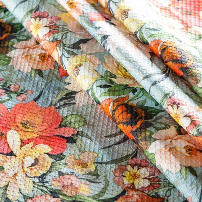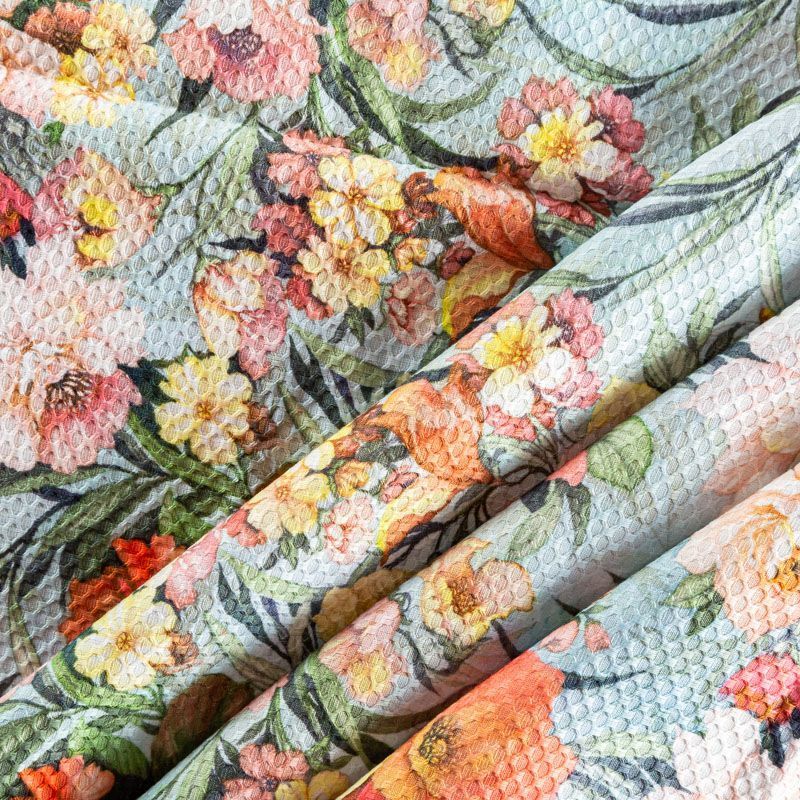 Итальянская хлопковая ткань с фактурным жаккардовым узором и цветочным принтом голубого оттенка. Ткань легкая, мягкая и приятная на ощупь, не мнется, тянется за счет эластана в составе, держит форму и ложится красивыми складками. Идеально подходит для пошива нарядных платьев, сарафанов и костюмов весенне-летнего сезона.