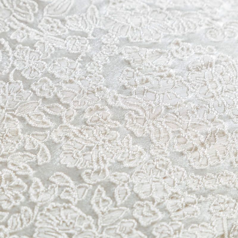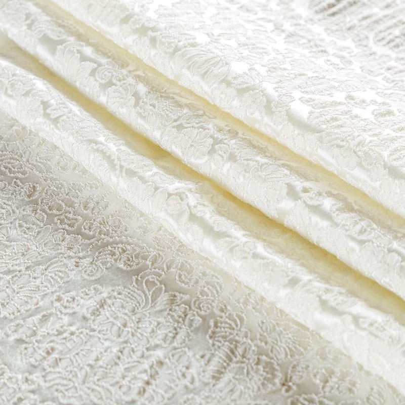 Итальянский жаккард молочного оттенка с изящным цветочным орнаметом. Ткань мягкая и пластичная, держит форму, хорошо драпируется. Повехность фактурная, матовая. Подойдет для создания вечерних  и свадебных платьев, нарядных костюмов, жакетов, юбок, корсетов, шорт.