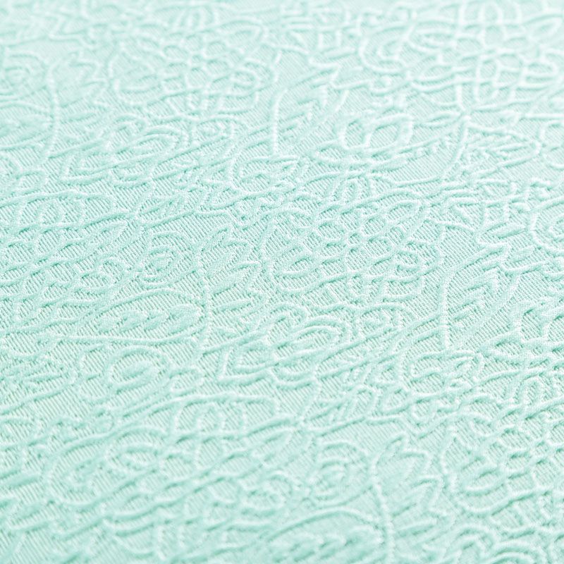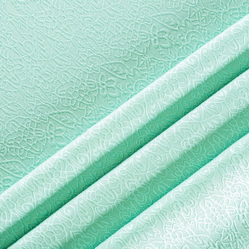 Нарядный жаккард на хлопковой основе с красивым сложным орнаментом мятного оттенка. Ткань легкая, но плотная, поверхность со сдержанным блеском объемная и текстурная, хорошо драпируется и держит форму, тянется за счет эластана в составе, не просвечивает. Подойдет для пошива нарядных вечерних костюмов, платьев-футляров в стиле Dior, жакетов, топов, легких пальто, бомберов, юбок или шорт.