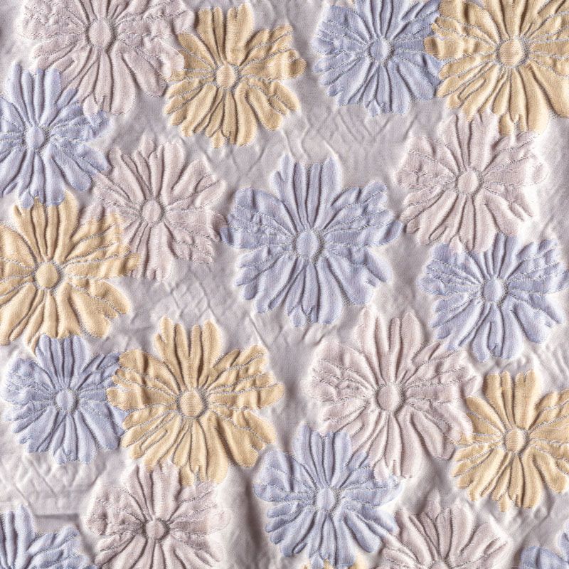 Итальянский жаккард с нежным и романтичным дизайном из фактурных ромашек голубого, светло-желтого и розового оттенков. Ткань легкая, но плотная, поверхность матовая, объемная и текстурная, хорошо драпируется и держит форму, не тянется, не просвечивает. Подойдет для пошива нарядных вечерних костюмов, платьев-футляров в стиле Dior, жакетов, топов, летних пальто, бомберов, юбок или шорт.