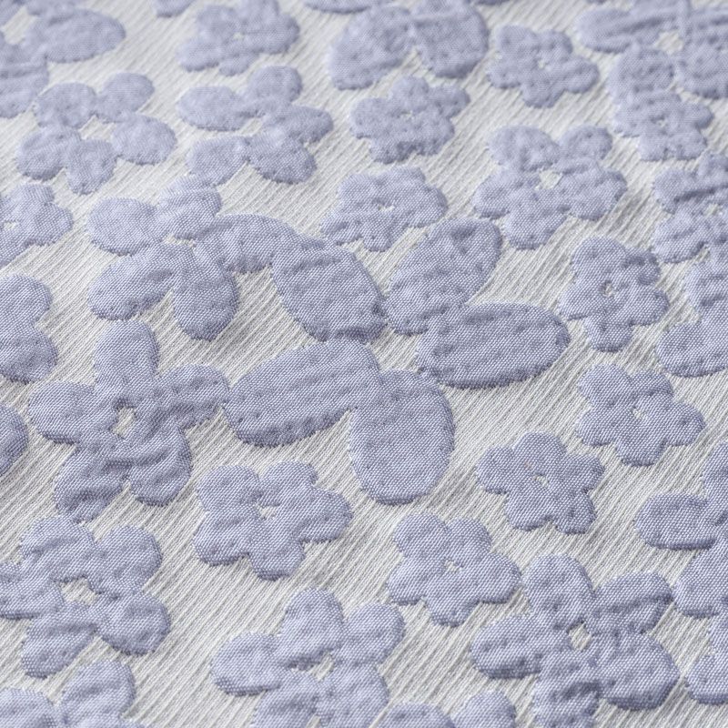 Молочный рельефный фон итальянского жаккарда  дополнен узором из объемных разновеликих цветов простой формы холодного голубого оттенка. Ткань легкая, средней плотности, не просвечивает, не тянется. Хорошо держит форму и драпируется. Идеально подойдет для платьев различных силуэтов, костюмов, жакетов, юбок, шорт, легких пальто.