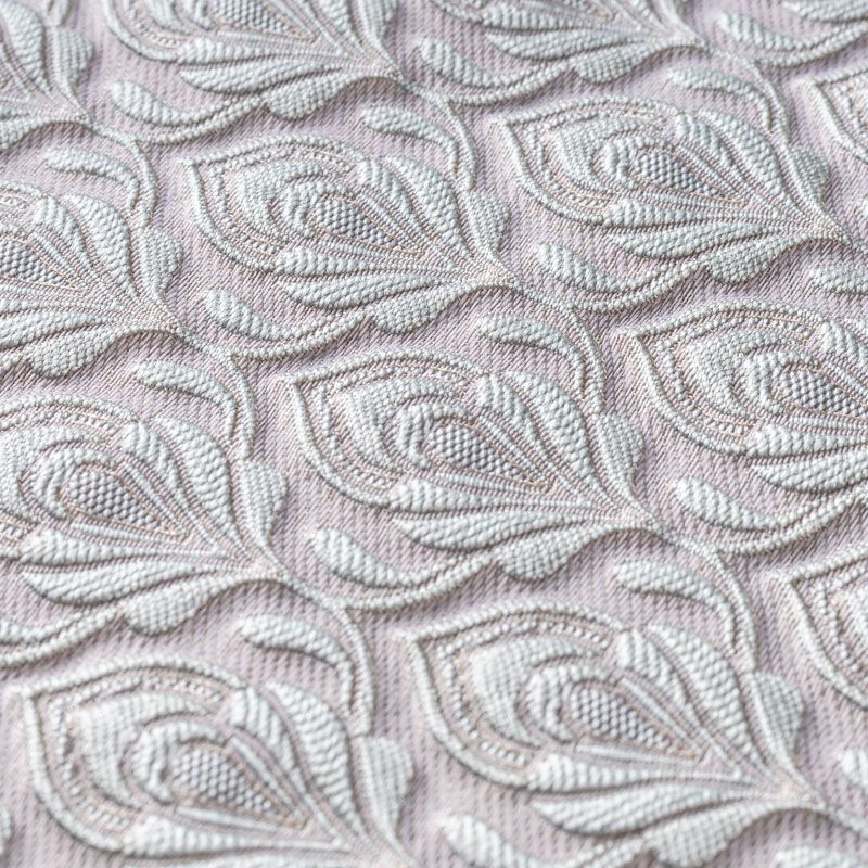Нежный пудрово-розовый фон итальянского жаккарда  дополнен объемным фантазийным узором молочного оттенка. Ткань легкая, средней плотности, не просвечивает, не тянется. Хорошо держит форму и драпируется. Идеально подойдет для платьев различных силуэтов, костюмов, жакетов, юбок, шорт, легких пальто.
