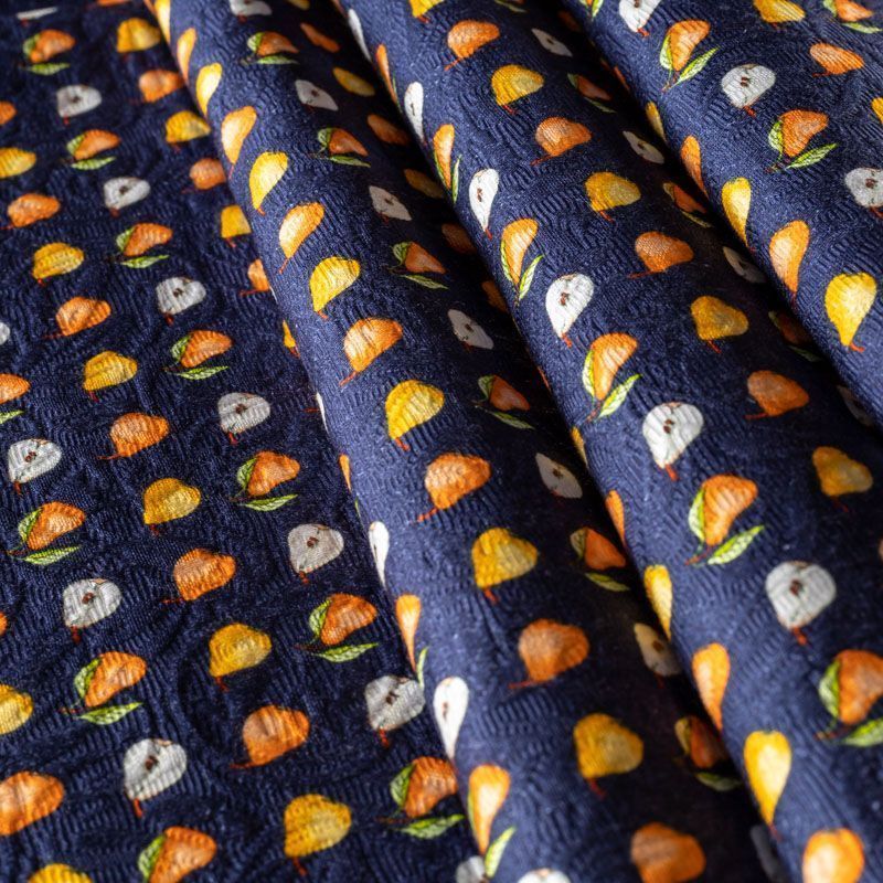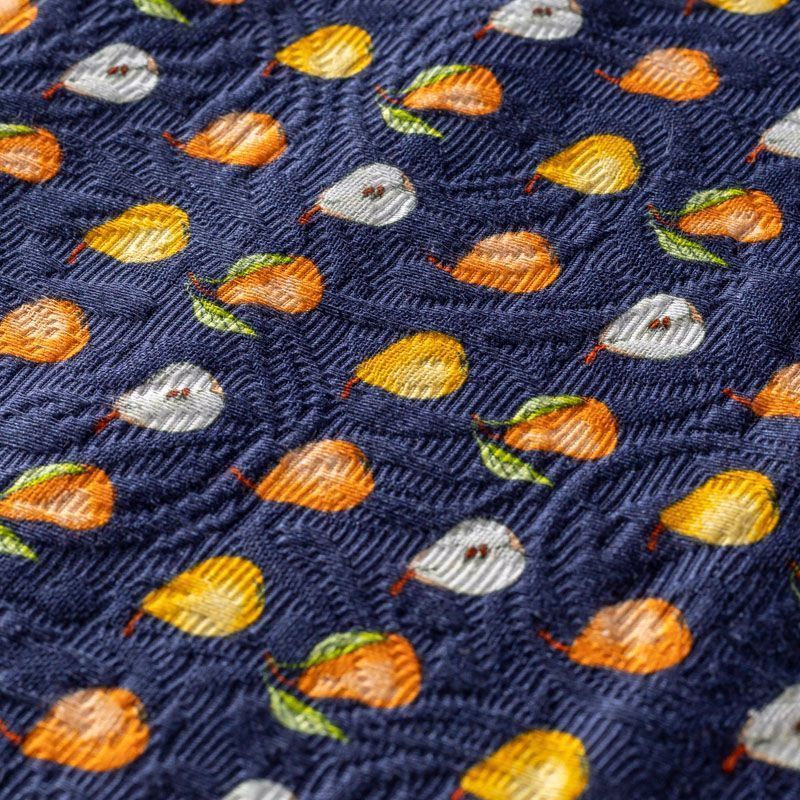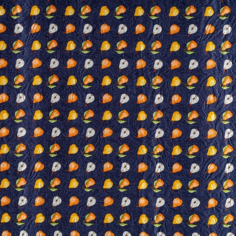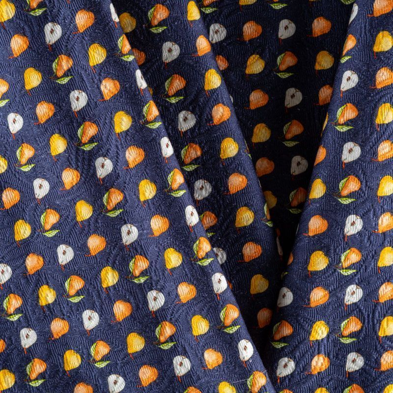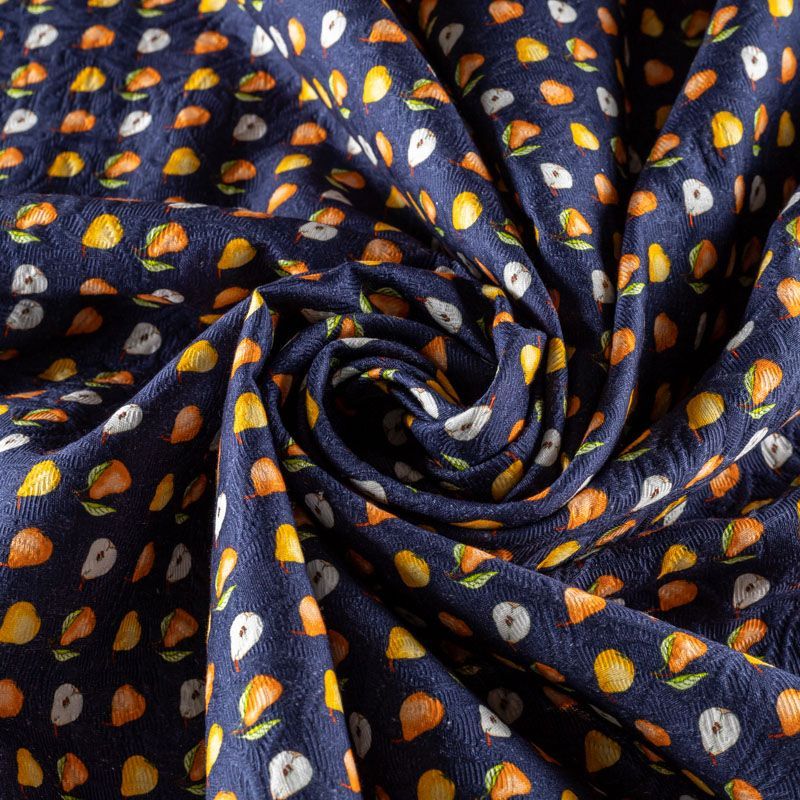 Итальянский хлопковый фактурный жаккард в синем цвете с милым мелким принтом в виде спелых груш. Ткань пластичная, средней плотноти, легкая, непрозрачная, приятная на ощупь, держит форму, хорошо драпируется. Будет комфортна для пошива костюма, жакета, женственного платья, юбки, брюк, шорт, легкого пальто, мягкого бомбера.