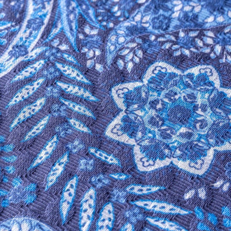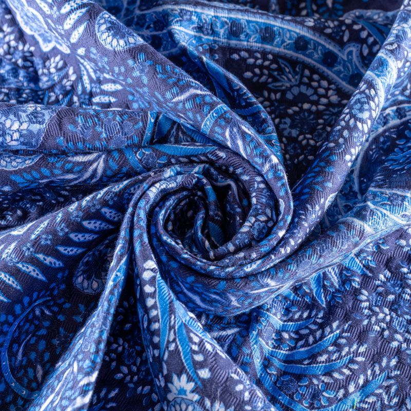 Итальянский хлопковый жаккард с принтом пейсли в синих ярких оттенках. Ткань средней плотности, поверхность матовая, объемная, фактурная, хорошо драпируется и держит форму, не тянется, не просвечивает. Подойдет для пошива костюмов, платьев-футляров, жакетов, топов, летних пальто, бомберов, юбок или шорт.