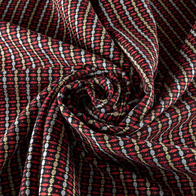 Мягкий хлопковый жаккард в черном цвете с ярким мелким абстрактным узором. Ткань пластичная, непрозрачная, приятная на ощупь, тянется за счет эластана в составе, форму не держит, но хорошо драпируется красивыми складками. Будет комфортна для пошива костюма, женственного платья, юбки или брюк.