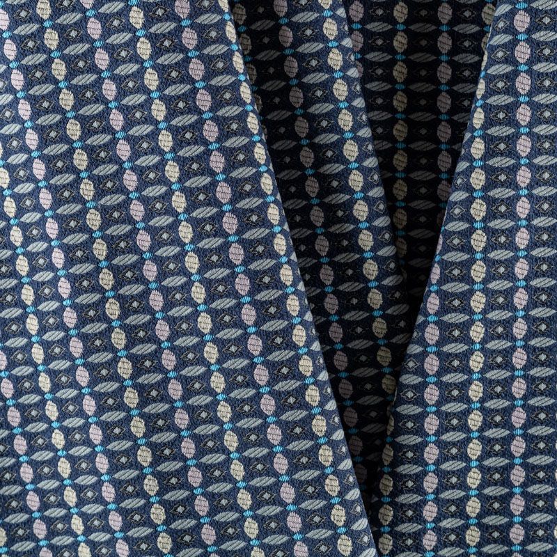 Мягкий хлопковый жаккард в серо-синей цветовой гамме с мелким абстрактным узором. Ткань пластичная, непрозрачная, приятная на ощупь, тянется за счет эластана в составе, форму не держит, но хорошо драпируется красивыми складками. Будет комфортна для пошива костюма, женственного платья, юбки или брюк.
